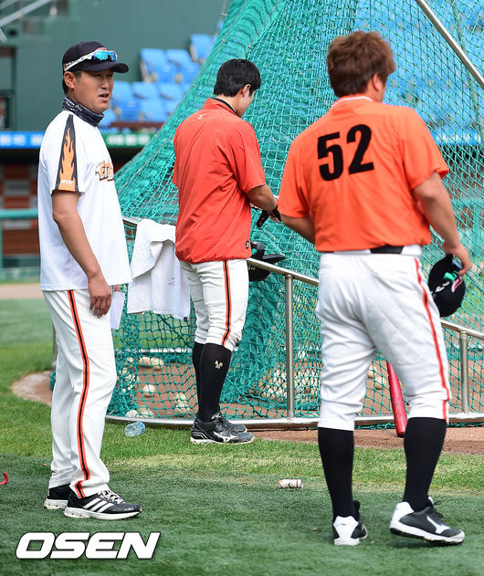 23일 오후 대전 한밭야구장에서 '2014 한국야쿠르트 세븐 프로야구' 한화 이글스와 NC 다이노스의 경기가 열릴 예정인 가운데 양팀 훈련 시간에 한화 장종훈 코치가 김태균에게 말을 걸고 있다.