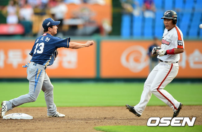 23일 오후 대전 한밭야구장에서 열린 '2014 한국야쿠르트 세븐 프로야구' 한화 이글스와 NC 다이노스의 경기, 1회말 무사 주자 1,2루 한화 김경언의 1루수 병살타때 NC 유격수 손시헌이 2루에서 정근우를 포스아웃 시킨 후 1루로 송구하고 있다.