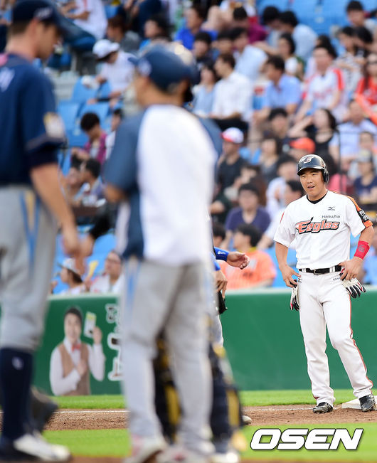 23일 오후 대전 한밭야구장에서 열린 '2014 한국야쿠르트 세븐 프로야구' 한화 이글스와 NC 다이노스의 경기, 1회말 무사 주자 1루 한화 정근우가 찰리에게 볼넷을 얻어내며 출루한 후 찰리를 바라보고 있다.