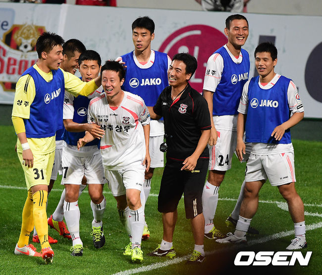 후반 상주 상무 이승현이 선제골을 작렬시킨 뒤 동료들과 환호하고 있다.