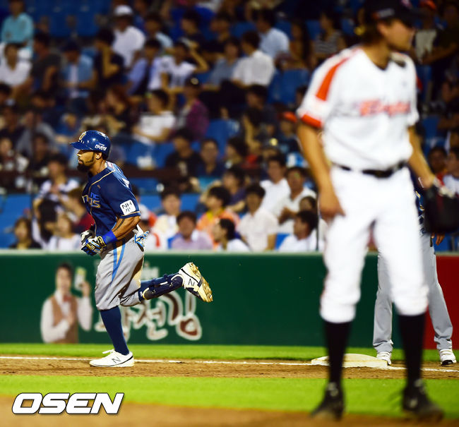 23일 오후 대전 한밭야구장에서 열린 '2014 한국야쿠르트 세븐 프로야구' 한화 이글스와 NC 다이노스의 경기, 7회초 1사 주자 2루 NC 테임즈가 우월 투런 홈런을 날린 후 그라운드를 돌고 있다.