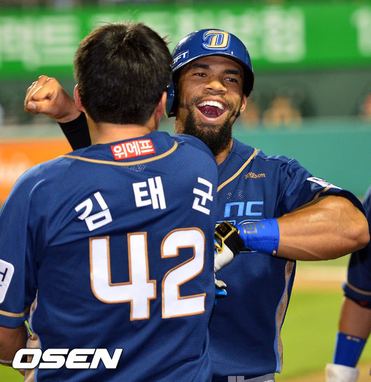 23일 오후 대전 한밭야구장에서 열린 '2014 한국야쿠르트 세븐 프로야구' 한화 이글스와 NC 다이노스의 경기, 7회초 1사 주자 2루 NC 테임즈가 우월 투런 홈런을 날린 후 덕아웃에서 김태군과 수염 세레모니를 한 후 기뻐하고 있다.