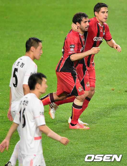 후반 FC서울 몰리나가 프리킥으로 동점골을 터트린 뒤 동료 에스쿠데로와 환호하고 있다.