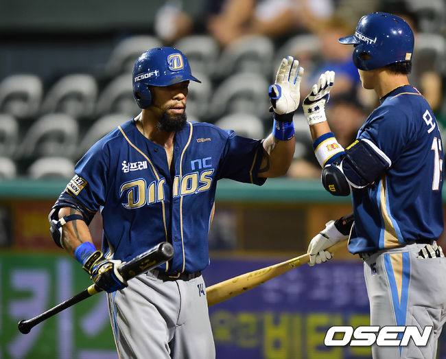 23일 오후 대전 한밭야구장에서 열린 '2014 한국야쿠르트 세븐 프로야구' 한화 이글스와 NC 다이노스의 경기, 7회초 1사 주자 2루 NC 테임즈가 우월 투런 홈런을 날린 후 모창민과 하이파이브를 하고 있다.