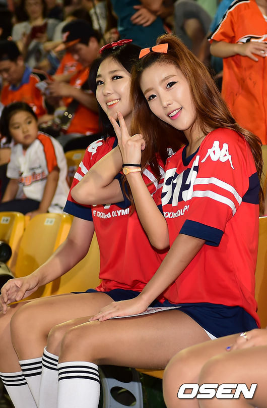 23일 오후 대전 한밭야구장에서 열린 '2014 한국야쿠르트 세븐 프로야구' 한화 이글스와 NC 다이노스의 경기, 한밭구장 좌석에서 한화 치어리더들이 응원을 깜찍한 응원을 펼치고 있다.