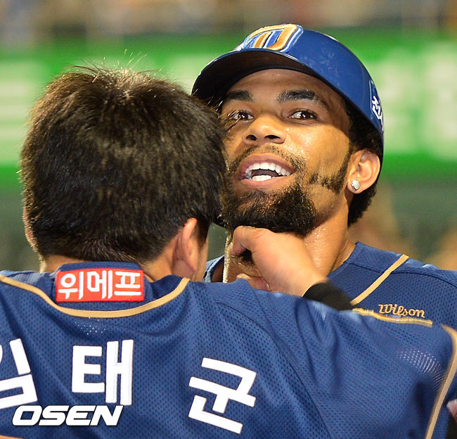 23일 오후 대전 한밭야구장에서 열린 '2014 한국야쿠르트 세븐 프로야구' 한화 이글스와 NC 다이노스의 경기, 7회초 1사 주자 2루 NC 테임즈가 우월 투런 홈런을 날린 후 덕아웃에서 김태군과 수염 세레모니를 하고 있다.