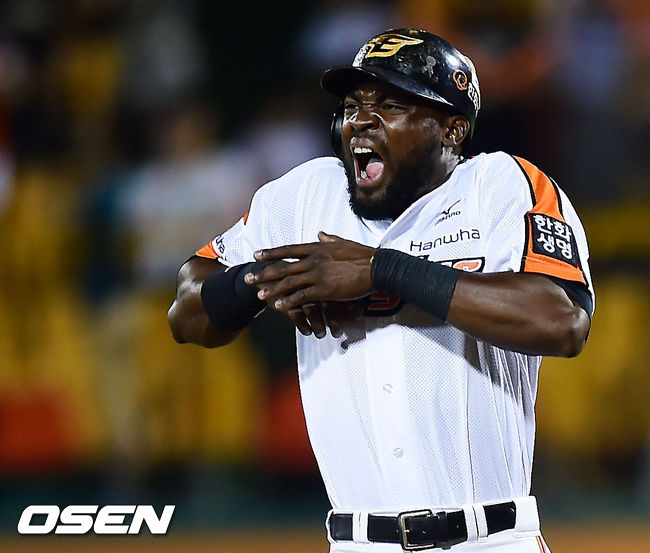 23일 오후 대전 한밭야구장에서 열린 '2014 한국야쿠르트 세븐 프로야구' 한화 이글스와 NC 다이노스의 경기, 9회말 무사 주자 1루 한화 최진행의 안타때 1루 주자 피에가 2루로 향하며 손에 송구를 맞아 고통스러워하고 있다.