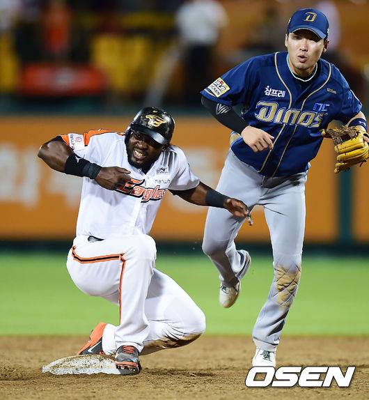 23일 오후 대전 한밭야구장에서 열린 '2014 한국야쿠르트 세븐 프로야구' 한화 이글스와 NC 다이노스의 경기, 9회말 무사 주자 1루 한화 최진행의 안타때 1루 주자 피에가 2루로 향하며 손에 송구를 맞아 고통스러워하고 있다.