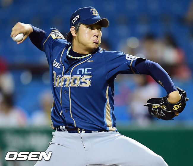 23일 오후 대전 한밭야구장에서 열린 '2014 한국야쿠르트 세븐 프로야구' 한화 이글스와 NC 다이노스의 경기, 9회말 2사 주자 1,2루 마운드에 오른 NC 이민호가 힘차게 공을 뿌리고 있다.