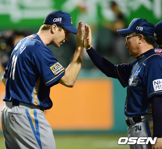 경기를 마치고 NC 찰리가 김경문 감독과 하이파이브를 하고 있다. / rumi@osen.co.kr