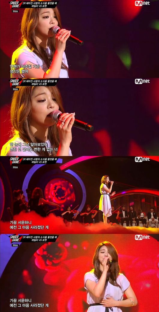 에일리는 23일 오후 11시 첫 방송 된 케이블채널 Mnet '싱어게임‘에서 하림 '사랑이 다른 사랑으로 잊혀지네'로 YCM의 두 번째 주자로 출전해 화려한 가창력을 뽐냈지만 포맨에 무릎을 꿇어야만 했다.