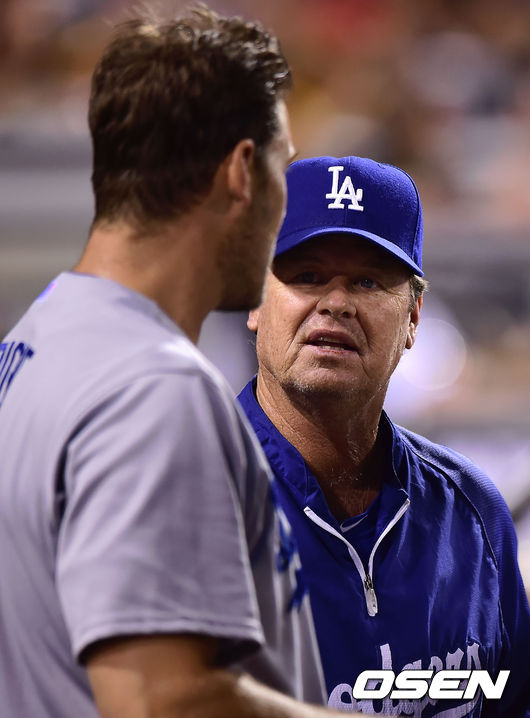 다저스 허니컷 코치가 6회말 수비를 마친 라이트와 이야기를 나누고 있다.