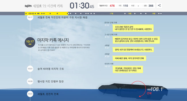 ‘세월호 72시간의 기록’은 사건 발생 이후 72시간 동안 세월호 내·외부에 어떤 일들이 있었는지를 시간대별로 재구성한 인터렉티브 추모페이지로, 세월호 참사 관련 뉴스들과 구조자, 실종자, 희생자들의 현황 등의 정보를 한눈에 살펴볼 수 있다.