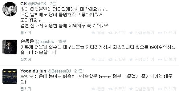 윤두준, 손동운과 이기광은 24일 오후 각자의 트위터를 통해 대구에서 열린 팬싸인회 지각 사건에 대해 팬들에게 사과했다.