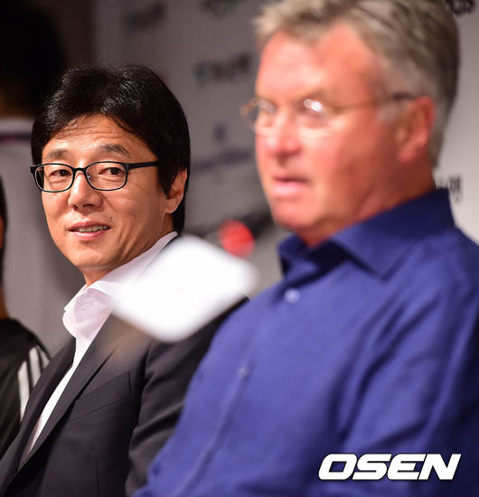기자회견에 참석한 황선홍 감독과 히딩크가 취재진의 질문을 듣고 있다.