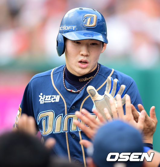24일 오후 대전 한밭야구장에서 열린 '2014 한국야쿠르트 세븐 프로야구' 한화 이글스와 NC 다이노스의 경기, 1회초 1사 주자 1루 NC 나성범의 우중간 선취 1타점 적시타때 홈을 밟은 박민우가 덕아웃에서 동료들과 하이파이브를 하고 있다.