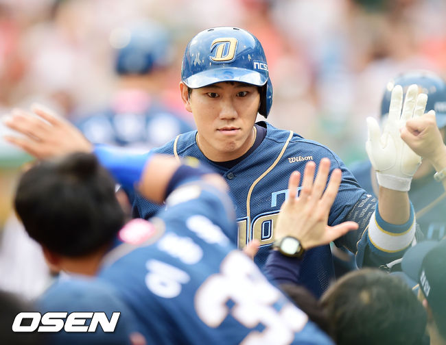 24일 오후 대전 한밭야구장에서 열린 '2014 한국야쿠르트 세븐 프로야구' 한화 이글스와 NC 다이노스의 경기, 1회초 1사 주자 2,3루 NC 모창민이 좌월 스리런 홈런을 날린 후 덕아웃에서 동료들과 하이파이브를 하고 있다.