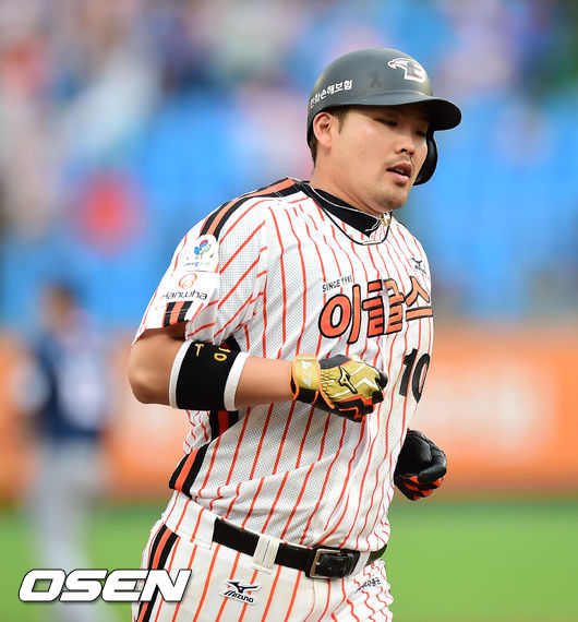 24일 오후 대전 한밭야구장에서 열린 '2014 한국야쿠르트 세븐 프로야구' 한화 이글스와 NC 다이노스의 경기, 1회말 1사 주자 1,2루 한화 김태완이 중월 스리런 홈런을 날린 후 그라운드를 돌고 있다.