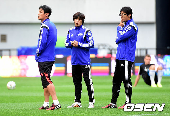 훈련에 참가한 FC서울 최용수 감독, 수원 삼성 서정원 감독, 포항 스틸러스 황선홍 감독이 대화를 나누고 있다.