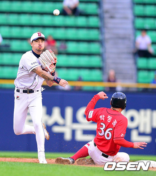 24일 오후 서울 잠실구장에서 열린 2014 한국야쿠르트 세븐 프로야구 두산 베어스와 SK 와이번스의 경기 2회초 1사 1,3루 SK 김성현의 병살아웃때 두산 오재원 2루수가 1루 주자 박정권을 포스아웃 시킨후 1루로 송구하고 있다.