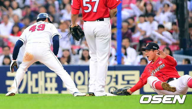 24일 오후 서울 잠실구장에서 열린 2014 한국야쿠르트 세븐 프로야구 두산 베어스와 SK 와이번스의 경기 1회말 무사 1루 두산 오재원의 헛스윙 삼진때 런다운 걸린 1루 주자 민병헌이 세이프되고 있다.