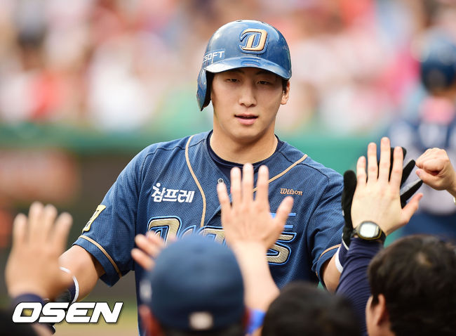 24일 오후 대전 한밭야구장에서 열린 '2014 한국야쿠르트 세븐 프로야구' 한화 이글스와 NC 다이노스의 경기, 1회초 1사 주자 1,2루 NC 권희동의 좌중간 1타점 적시타때 홈을 밟은 나성범이 덕아웃에서 동료들과 하이파이브를 하고 있다.