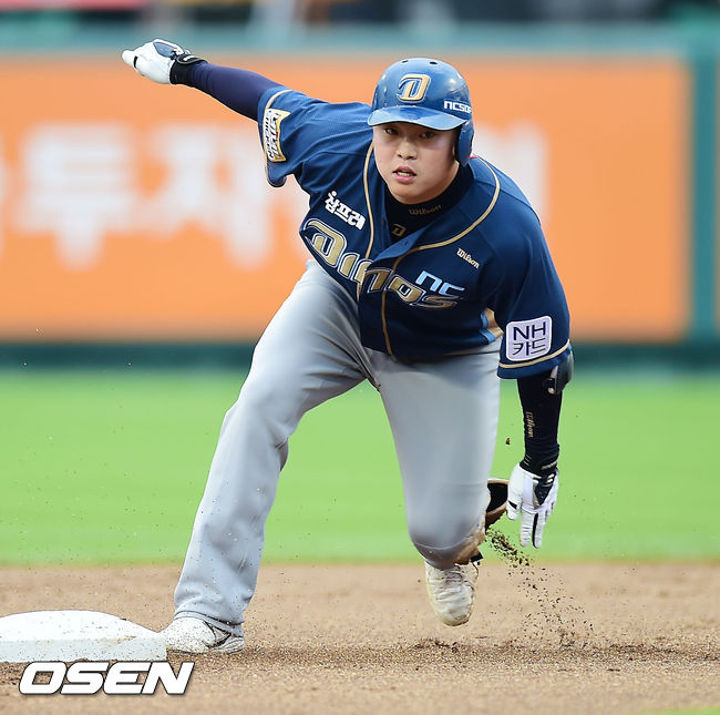 24일 오후 대전 한밭야구장에서 열린 '2014 한국야쿠르트 세븐 프로야구' 한화 이글스와 NC 다이노스의 경기, 1회초 1사 주자 1,2루 NC 권희동이 좌중간 1타점 적시타를 날린 후 2루에 몸을 날려 세이프 되고 있다.