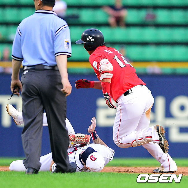 24일 오후 서울 잠실구장에서 열린 2014 한국야쿠르트 세븐 프로야구 두산 베어스와 SK 와이번스의 경기 3회초 1사 1루 SK 최정의 안타, 두산 수비 실책으로 최정이 3루까지 질주하고 있다.