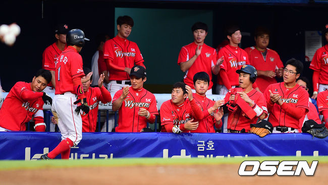 24일 오후 서울 잠실구장에서 열린 2014 한국야쿠르트 세븐 프로야구 두산 베어스와 SK 와이번스의 경기 3회초 1사 1루 SK 최정의 안타와 두산 수비 실책으로 선취 득점을 올린 1루 주자 조동화가 동료들과 하이파이브를 하고 있다.