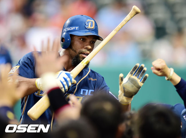 24일 오후 대전 한밭야구장에서 열린 '2014 한국야쿠르트 세븐 프로야구' 한화 이글스와 NC 다이노스의 경기, 3회초 1사 주자 3루 NC 모창민의 좌익수 희생플라이때 홈을 밟은 테임즈가 덕아웃에서 동료들과 하이파이브를 하고 있다.