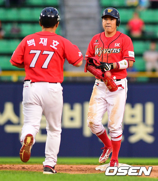 24일 오후 서울 잠실구장에서 열린 2014 한국야쿠르트 세븐 프로야구 두산 베어스와 SK 와이번스의 경기 3회초 2사 1,3루 SK 나주환이 1타점 2루타를 날리고 백재호 코치와 하이파이브를 하고 있다.