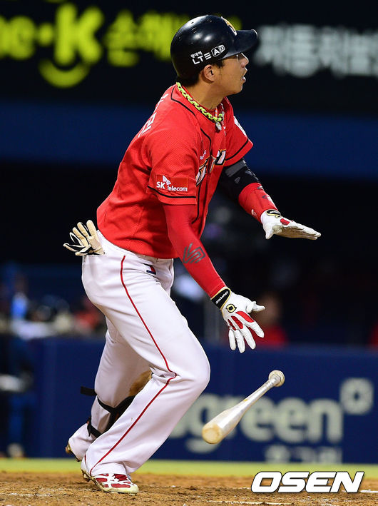 24일 오후 서울 잠실구장에서 열린 2014 한국야쿠르트 세븐 프로야구 두산 베어스와 SK 와이번스의 경기 4회초 2,3루 SK 김강민이 2타점 적시타를 날리고 있다.