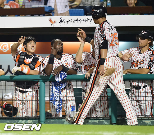 24일 오후 대전 한밭야구장에서 열린 '2014 한국야쿠르트 세븐 프로야구' 한화 이글스와 NC 다이노스의 경기, 3회말 2사 주자 1,2루 한화 대타 조인성의 우익수 앞 역전 1타점 적시타때 홈을 밟은 최진행이 덕아웃에서 동료들과 기쁨을 나누고 있다.