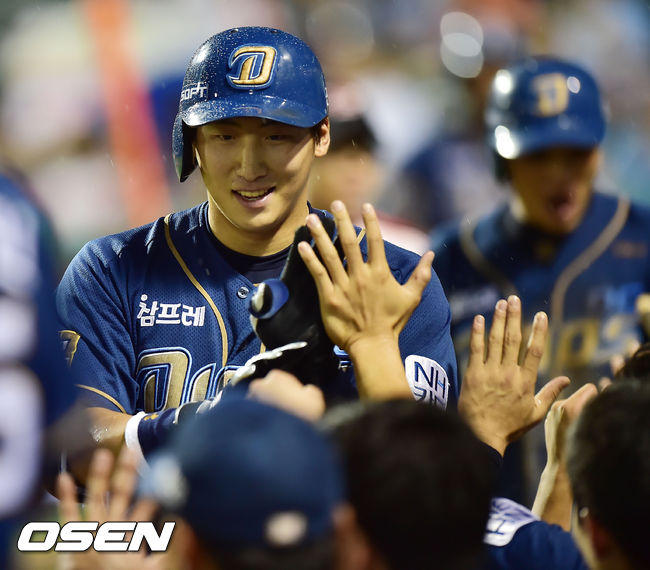 24일 오후 대전 한밭야구장에서 열린 '2014 한국야쿠르트 세븐 프로야구' 한화 이글스와 NC 다이노스의 경기, NC 나성범이 4회 2사 2루에서 한화 안영명을 상대로 오른똑 폴대 부분을 맞히는 듯한 홈런성 타구를 날렸으나 심판 합의 판정 끝에 파울로 최종 선언됐다. 나성범이 홈런성 타구를 날린 후 덕아웃에서 기뻐하고 있다.