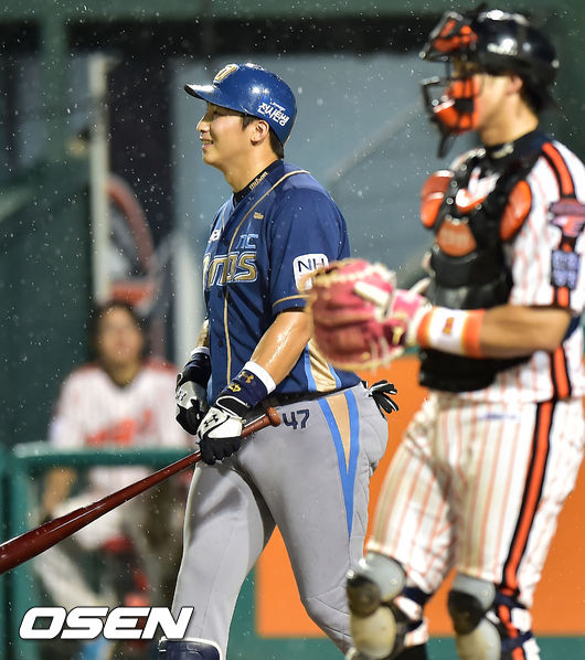 24일 오후 대전 한밭야구장에서 열린 '2014 한국야쿠르트 세븐 프로야구' 한화 이글스와 NC 다이노스의 경기, NC 나성범이 4회 2사 2루에서 한화 안영명을 상대로 오른똑 폴대 부분을 맞히는 듯한 홈런성 타구를 날렸으나 심판 합의 판정 끝에 파울로 최종 선언된 후 타석에 다시 서고 있다.