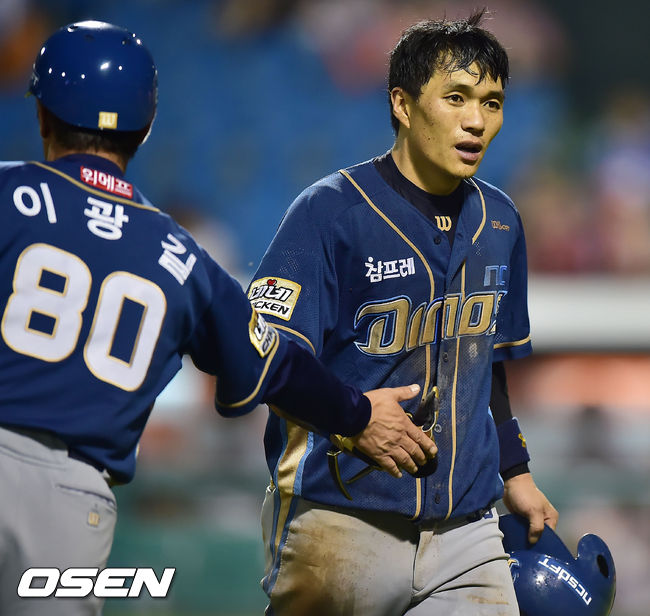 24일 오후 대전 한밭야구장에서 열린 '2014 한국야쿠르트 세븐 프로야구' 한화 이글스와 NC 다이노스의 경기, 5회초 1사 주자 만루 NC 이종욱이 우익수 오른쪽 2타점 적시타를 날린 후 1루에서 태그아웃 당하며 덕아웃으로 향하고 있다.이종욱이 아웃되는 동안 3루 주자 박민우도 홈을 밟았다.