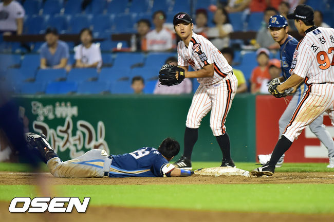 24일 오후 대전 한밭야구장에서 열린 '2014 한국야쿠르트 세븐 프로야구' 한화 이글스와 NC 다이노스의 경기, 5회초 1사 주자 만루 NC 이종욱이 우익수 오른쪽 2타점 적시타를 날린 후 1루에서 태그아웃 당하며 덕아웃으로 향하고 있다.이종욱이 아웃되는 동안 3루 주자 박민우도 홈을 밟았다.