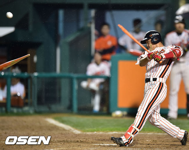 24일 오후 대전 한밭야구장에서 열린 '2014 한국야쿠르트 세븐 프로야구' 한화 이글스와 NC 다이노스의 경기, 4회말 1사 주자 없는 상황에서 한화 정근우가 유격수 땅볼 타구를 날리며 배트가 부러지고 있다.