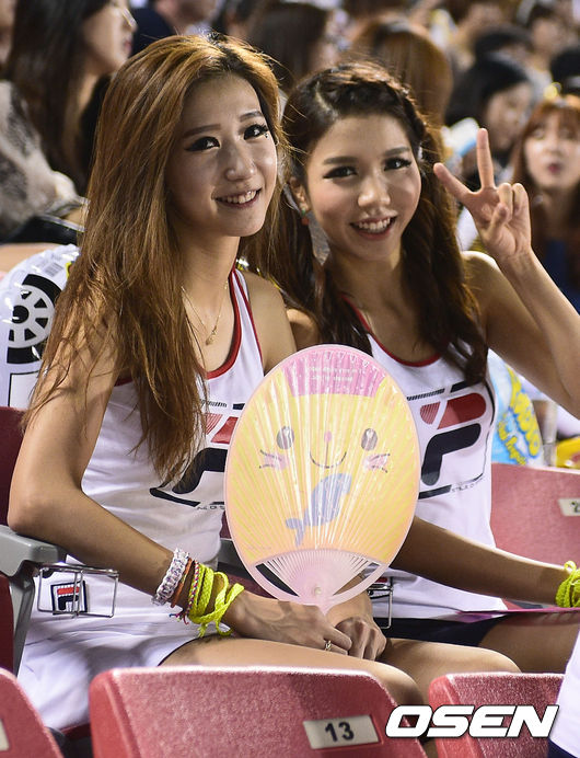 24일 오후 서울 잠실구장에서 열린 2014 한국야쿠르트 세븐 프로야구 두산 베어스와 SK 와이번스의 경기 두산 치어리더가 카메라를 향해 포즈를 취하고 있다.