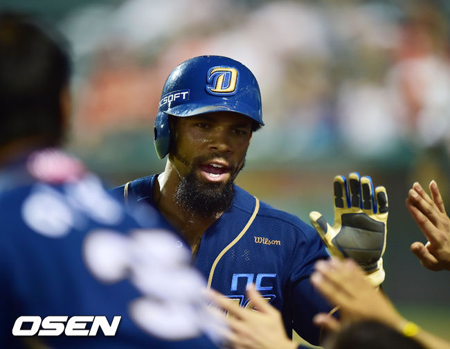 24일 오후 대전 한밭야구장에서 열린 '2014 한국야쿠르트 세븐 프로야구' 한화 이글스와 NC 다이노스의 경기, 6회초 1사 주자 만루 NC 지석훈의 유격수 앞 땅볼때 한화 유격수 실책으로 홈을 밟은 테임즈가 덕아웃에서 동료들과 하이파이브를 하고 있다.