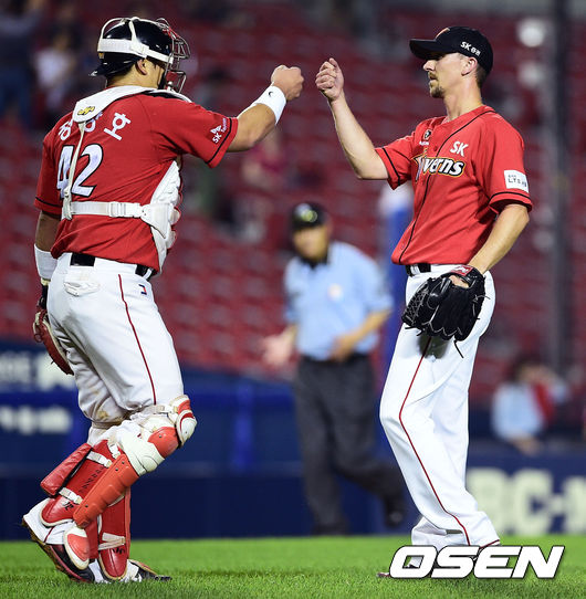 경기종료 후 SK 울프와 정상호 포수가 승리의 기쁨을 나누고 있다. / soul1014@osen.co.kr