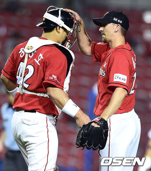 경기종료 후 SK 울프와 정상호 포수가 승리의 기쁨을 나누고 있다. / soul1014@osen.co.kr