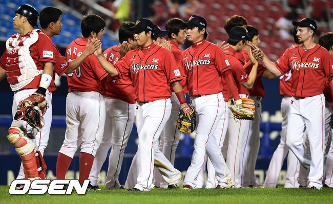 경기종료 후 SK 선수들이 승리의 기쁨을 나누고 있다. / soul1014@osen.co.kr