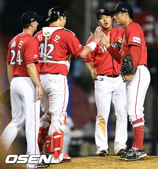 경기종료 후 SK 선수들이 승리의 기쁨을 나누고 있다. / soul1014@osen.co.kr