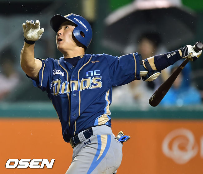 24일 오후 대전 한밭야구장에서 열린 '2014 한국야쿠르트 세븐 프로야구' 한화 이글스와 NC 다이노스의 경기, 8회초 2사 주자 1,2루 NC 손시헌이 좌익수 플라이 타구를 날리고 있다.