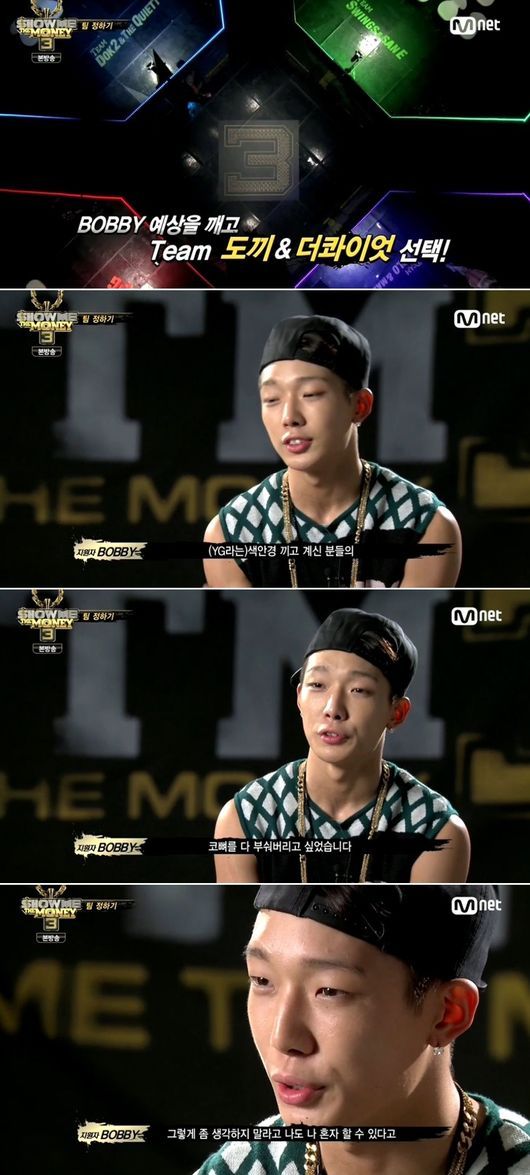 [OSEN=조민희 인턴기자] ‘쇼미더머니3’ YG 연습생 바비가 타블로와 마스터 우를 선택하지 않았다.