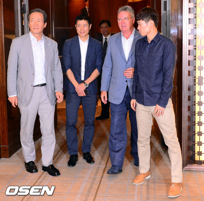25일 오후 서울 웨스틴조선호텔 바이올렛룸에서 진행된 정몽준-히딩크 오찬행사에 정몽준과 히딩크, 이영표, 박지성이 입장하고 있다.