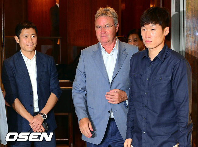 25일 오후 서울 웨스틴조선호텔 바이올렛룸에서 진행된 정몽준-히딩크 오찬행사에 정몽준과 히딩크, 이영표, 박지성이 입장하고 있다.