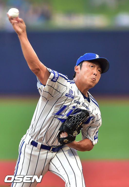 25일 오후 포항 야구장에서 열린 '2014 한국야쿠르트 세븐 프로야구' 삼성 라이온즈와 NC 다이노스의 경기, 삼성 선발 배영수가 힘차게 공을 뿌리고 있다.