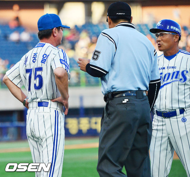 삼성 코칭스태프가 1루 주자 야마이코 나바로의 견제사에 대해 심판 합의 판정을 요청한 끝에 판정 번복을 이끌어냈다.